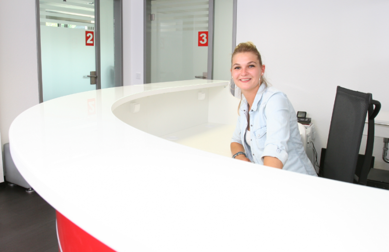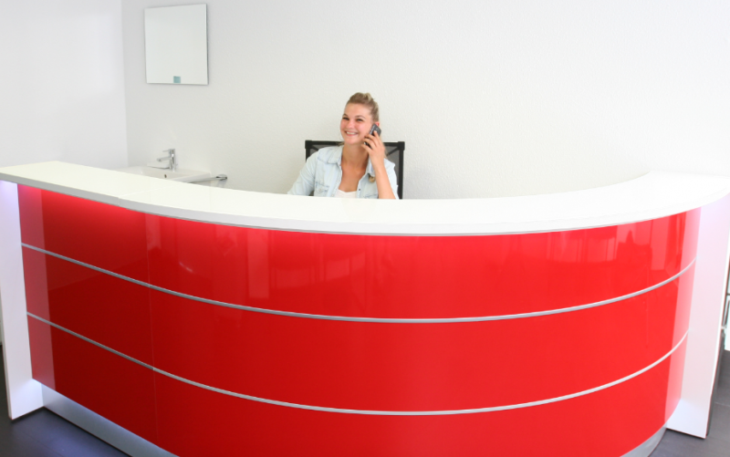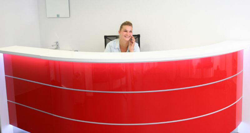 Der Empfangsbereich der Physiotherapie Kamen wurde ausgestattet mit unserer günstigen, beleuchteten, runden Empfangstheke der Empfangsmöbel - Serie Fun in roter Ausführung.